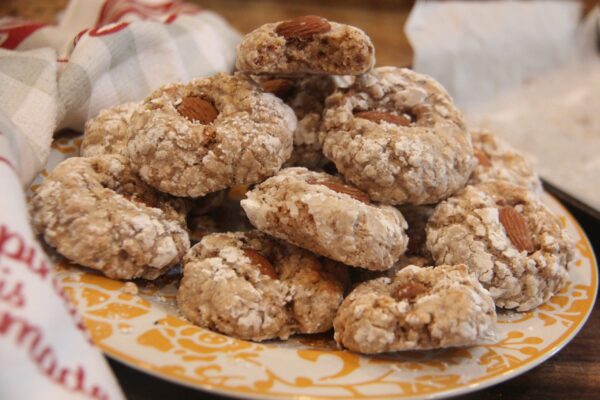 These biscotti are made with ground almonds, egg whites, almond flavoring, sugar and just a little bit of flour. I roll these cookies in powdered sugar and press a whole almond in the center before baking.