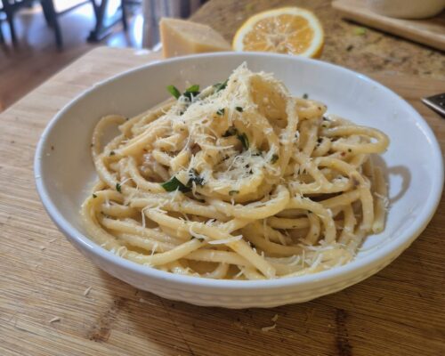 Also, the “creaminess” in this dish doesn’t come from cream—it comes from properly emulsifying the pasta water with the butter or olive oil and cheese. If your sauce ever feels too tight or dry, just add a splash of pasta water and toss again. It should look glossy, not heavy.