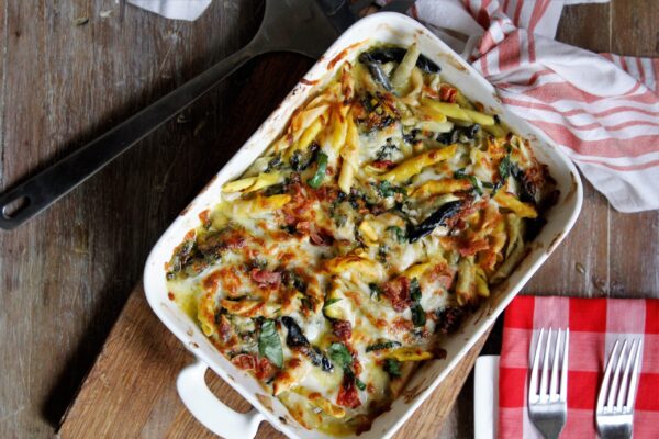 Growing up in the hills of Tuscany any baked pasta was my favorite. My Mom’s pasta bakes were simple and delicious. This dish brings back memories, from when I was a kidhanging around the kitchen counter, tasting whatever Mom was cooking.