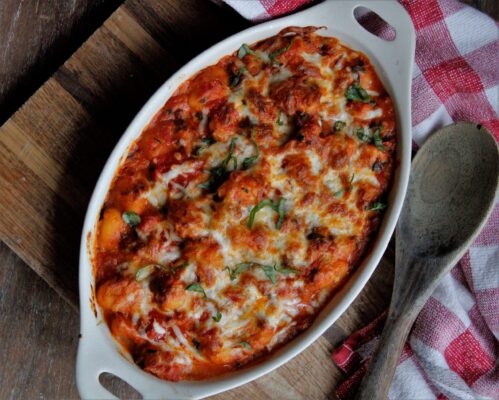 Little dumplings, in a hearty, beefy, Bolognese sauce topped with cheesy goodness, and baked to a golden delicious  make this gnocchi recipe a family favorite.
