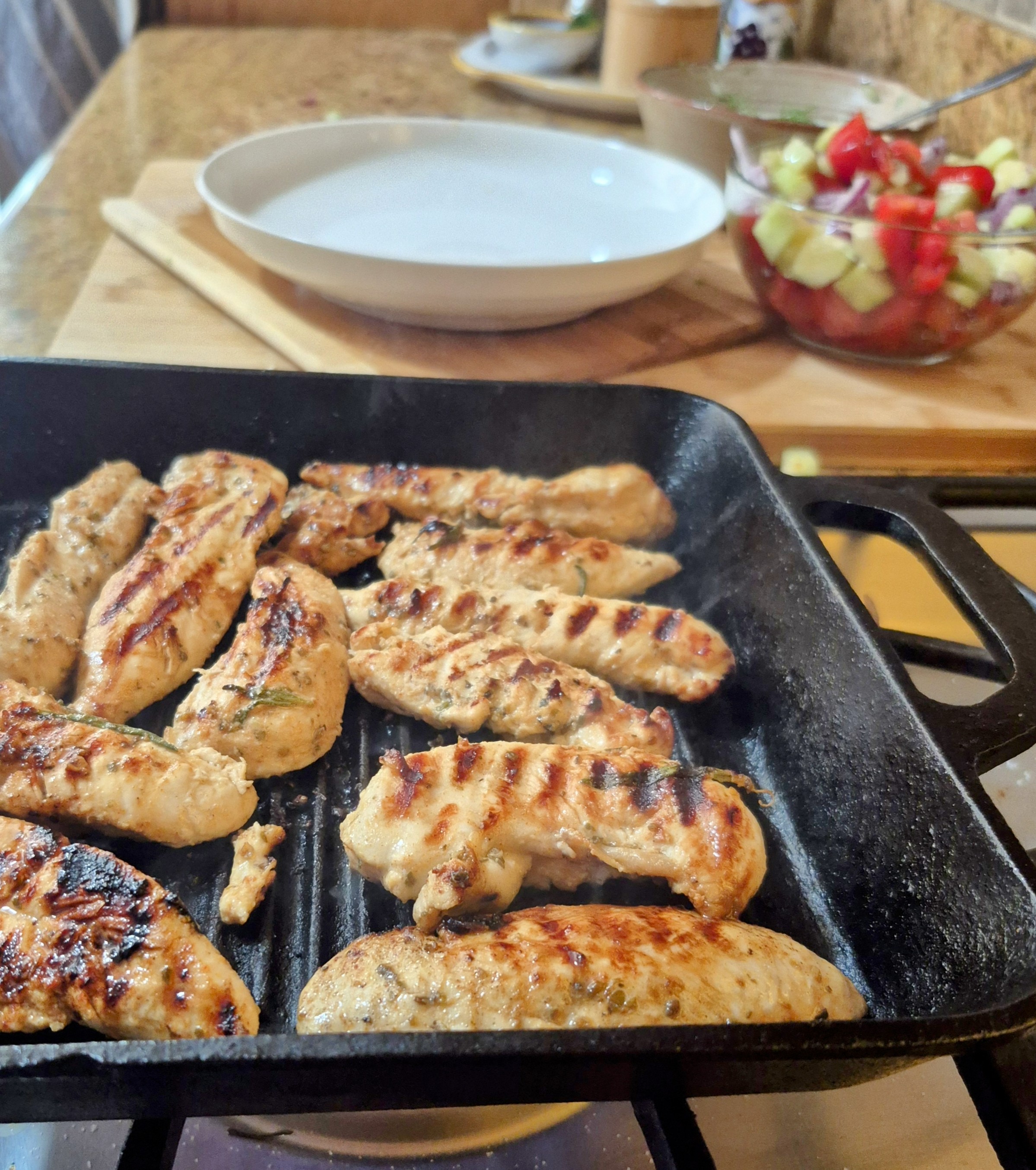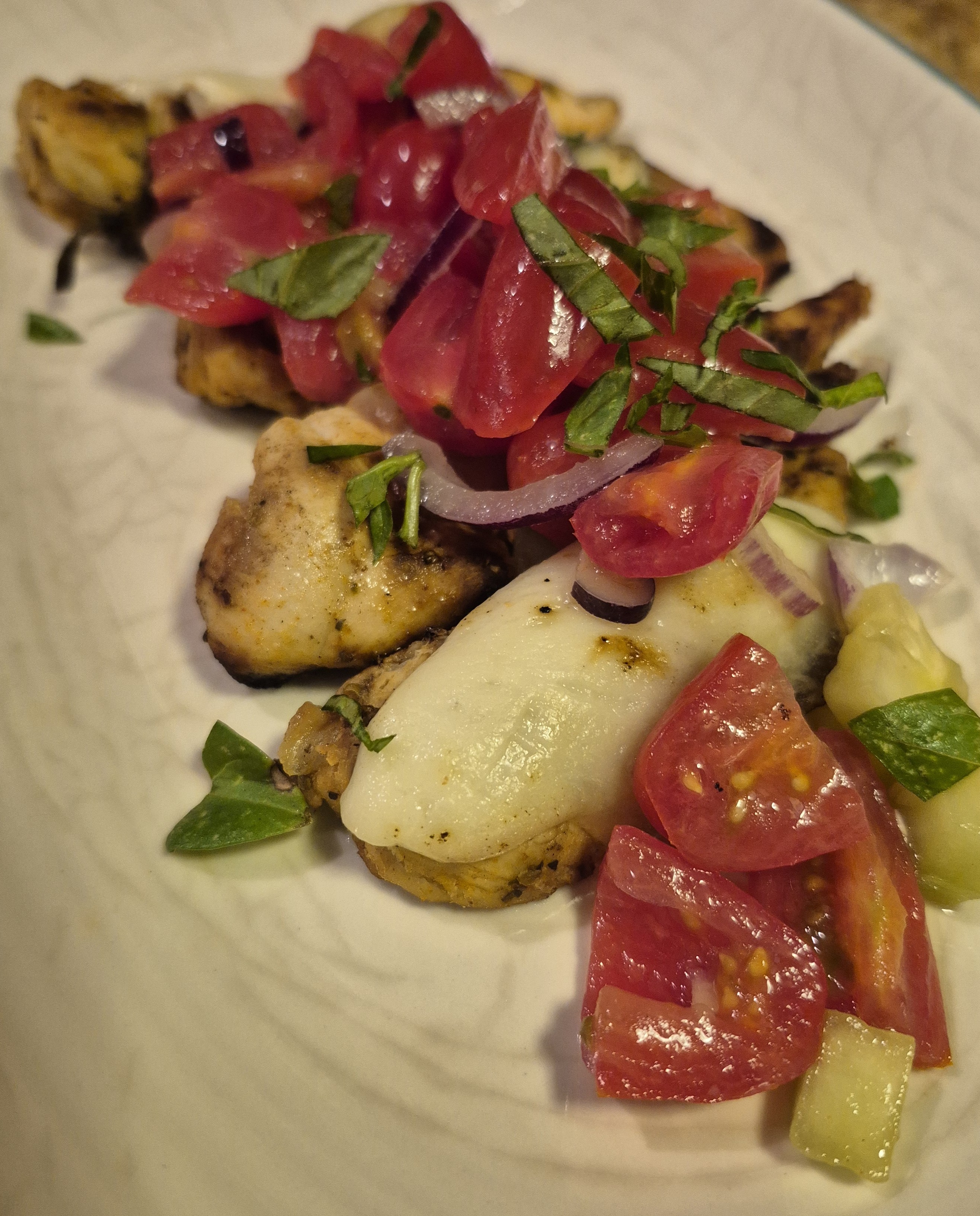 Quick-cooking chicken tenders grilled to juicy perfection, topped with fresh mozzarella and a zesty tomato bruschetta mix. A light, Italian-style dish perfect for warm weather meals.