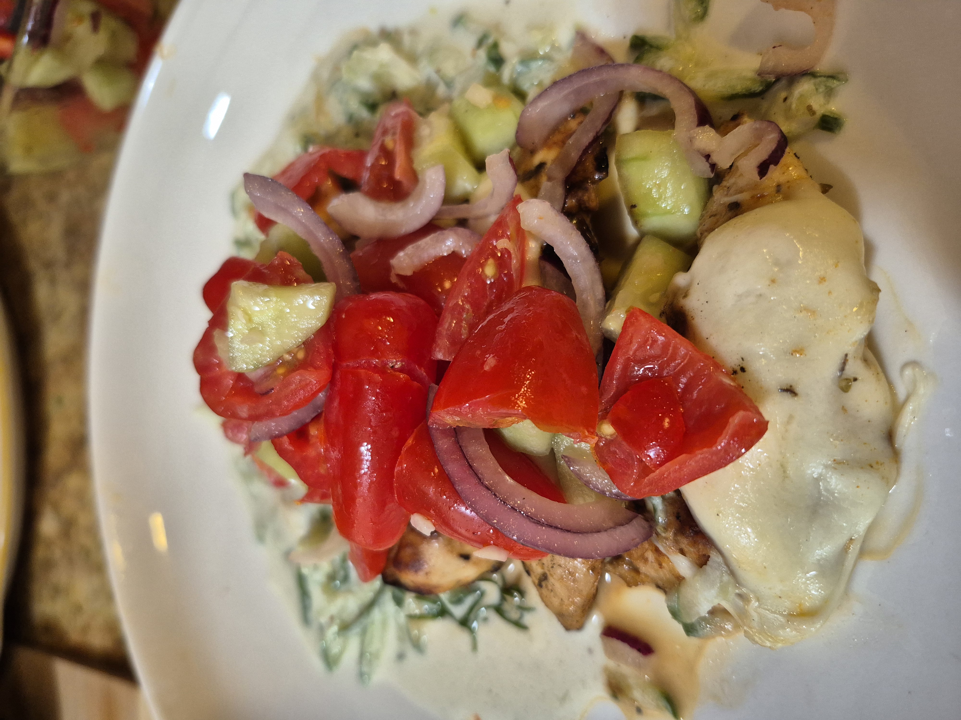The chicken is seasoned simply with garlic, olive oil, and herbs, then grilled until golden with crisp edges and tender centers. As soon as it comes off the grill, it’s topped with slices of fresh mozzarella that melt slightly from the heat. A generous spoonful of bright, garlicky tomato bruschetta—made with cherry tomatoes, basil, red onion, and a splash of balsamic—finishes the dish. Serve it with grilled bread, over arugula, or alongside a light pasta for an easy and elegant summer meal.