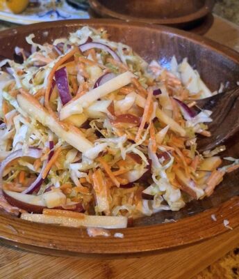 It’s crisp, colorful, and so refreshing—shredded cabbage and carrots tossed with thin slices of sweet apple, toasted pecans for warmth, and just enough shaved Parmesan to give it that savory Italian touch. Then everything gets coated in a creamy apple-cider vinaigrette that ties it all together. It’s the kind of side dish that not only balances your table but also surprises people with how simple and delicious it is. I make it every year, and there are never leftovers.