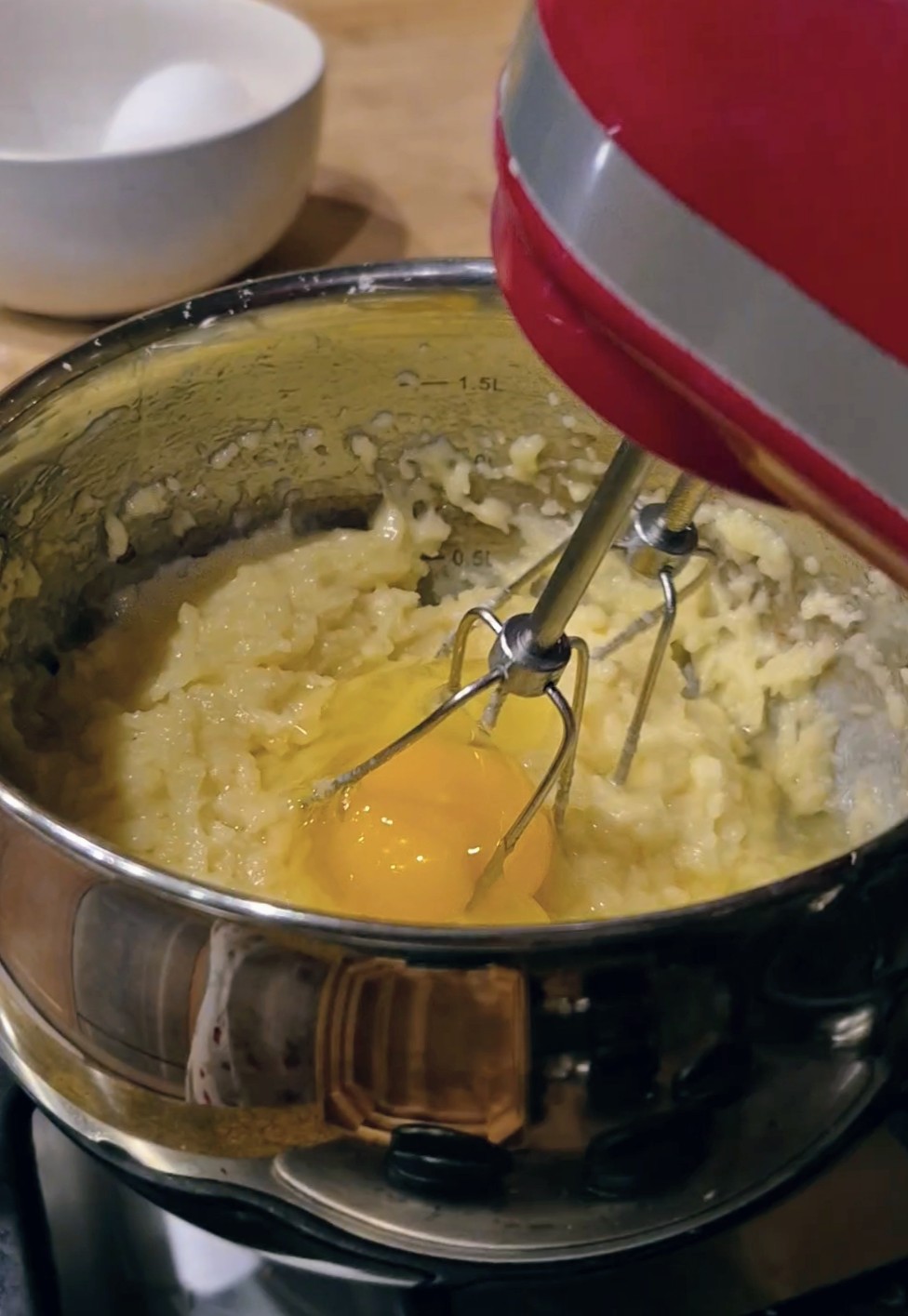 Add the eggs, orange zest, and vanilla and mix until fully combined.