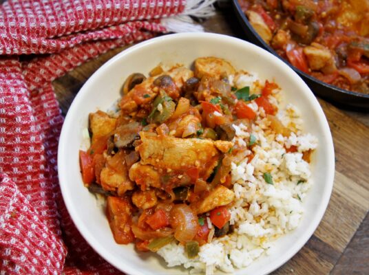 Tender chicken breast, red and green bell peppers and cremini mushrooms in a light tomato sauce full of Italian flavors, everyone loves. Serve it over herby parmesan rice for an easy complete weeknight dinner the is ready in 30 minutes.