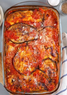 Eggplant parmesan, know as “parmigiana di melanzane” is a classic Italian dish made with layers of fried eggplant then baked with marinara sauce and cheese.