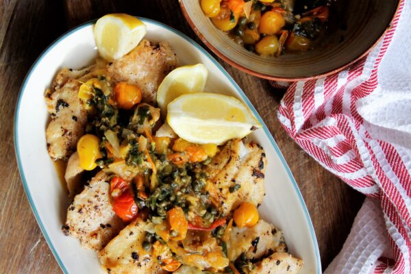 I used Ling cod. If you don’t like cod use another firm fish. I’ve made it with red snapper and halibut both delicious. The capers add a bit of tang which I like paired with fish dishes that also use tomatoes.