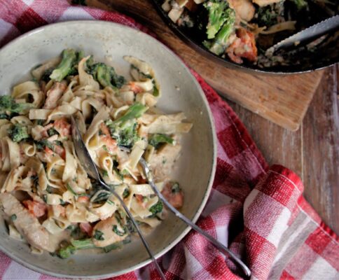 One: when your cooking the chicken for this Creamy Chicken Broccoli Fettuccini don’t overcook it, and be sure the saute pan is big enough to brown the chicken . Okay I know that was two. Next, always under cook the pasta just a bit this allows for the reheat. And finally always save some pasta water, this step is easily missed. And let me tell you, the pasta water with all it’s starch is a magical ingredient that thickens the sauce and adds more flavor. I always save more than I need just in case.