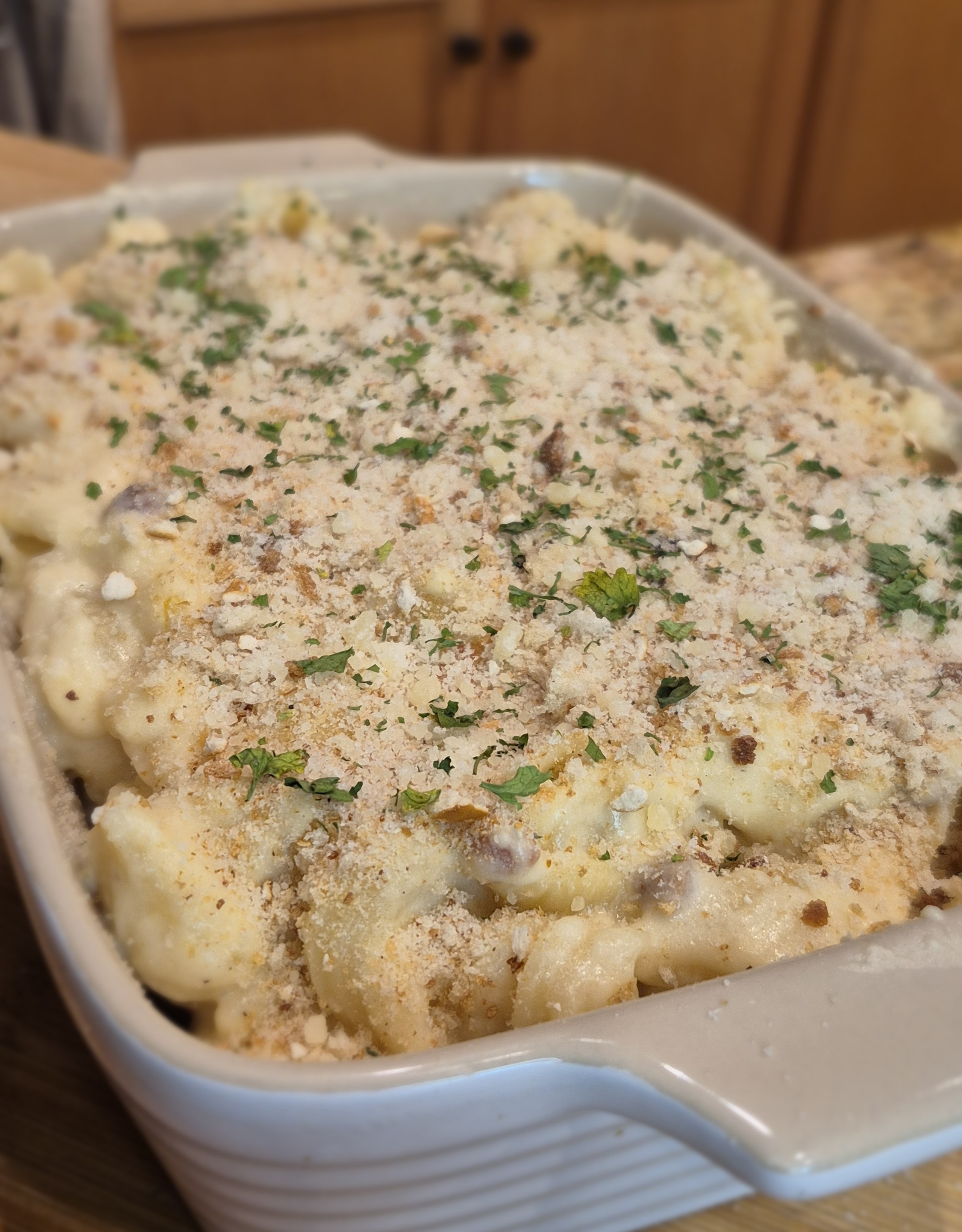 Pour the pasta mixture into a buttered 9×13-inch baking dish. Sprinkle evenly with the breadcrumb topping.