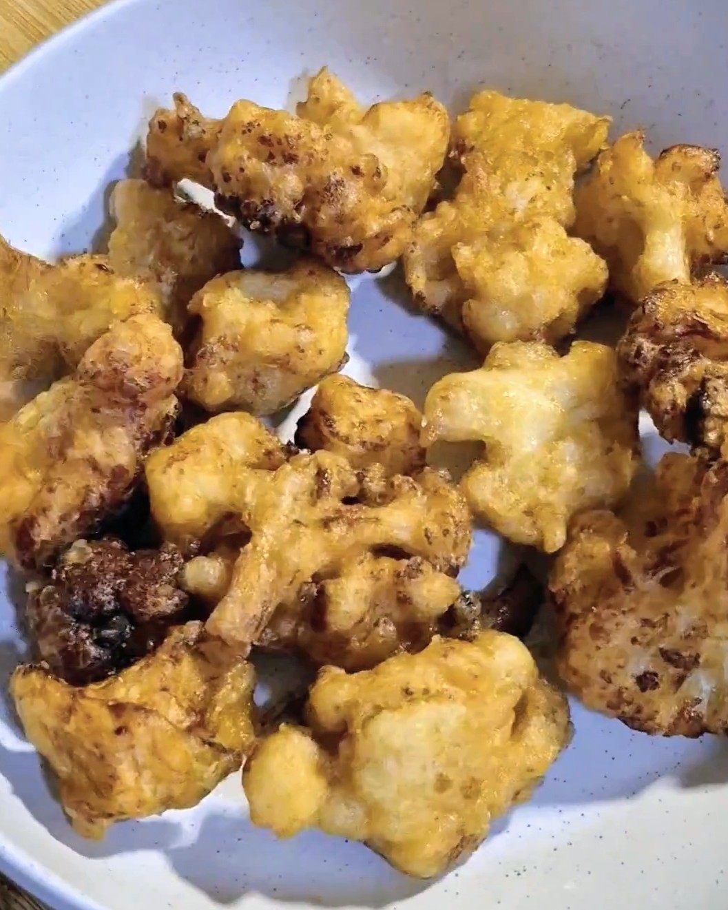 To bake: Preheat oven to 425°F (220°C). Line a baking sheet with parchment. Place battered florets on the sheet and spray with oil. Bake for 25–30 minutes, flipping halfway, until golden and crisp.