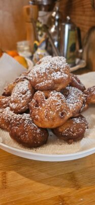 Second. the oil temperature needs to be between 360 and 375 degrees for the fritters to cook all the way through keeping them crispy on the outside and fluffy on the inside.  It’s a good idea to invest in a food thermometer or a counter top electric fryer!!!