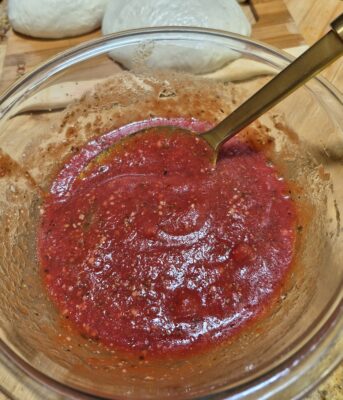 Use quality tomatoes: For the best flavor, use good-quality canned crushed tomatoes and tomato sauce. Look for San Marzano or Italian-style plum tomatoes if possible—they’re naturally sweeter and lower in acidity, which gives the sauce that rich, pizzeria-style taste. If they are whole crush them with your hands. for a slight chunky sauce or blend if you prefer a smoother consistency.