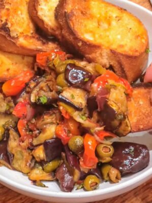 Stove top Eggplant caponata is an easy to make classic Italian dish that’s packed with chunks of eggplant, tomatoes, onions and herbs. It can be enjoyed as a dip, with bruschetta, a side dish, great served over grilled meats, or served as a pasta sauce. My mom would make eggplant caponata every summer using fresh produce from the garden.