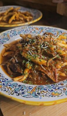 - Add the meat and cook until golden brown on all sides. Deglaze the pan with the red wine waiting until it evaporates before adding the onions. Then add all the onions and the beef broth. cover and simmer for 3 hours or until the meat is fork tender and onions desegrated. Cook your pasta el dente. Add one cup of pasta water to the sauce
