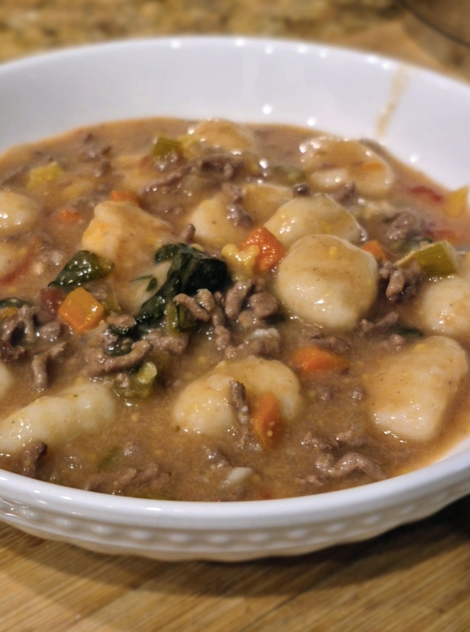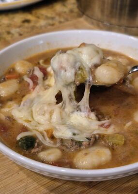 All the cozy flavors of classic lasagna come together in one comforting bowl. This hearty soup starts with a flavorful base of sautéed onion, celery, carrots, and garlic — the same way many traditional Italian soups begin — creating a rich, aromatic foundation. From there, it’s simmered with tender ground beef, crushed tomatoes, and soft, pillowy gnocchi that take the place of lasagna noodles. Finished with melty mozzarella, creamy ricotta, and a touch of parmesan, it’s the kind of meal that feels like a warm hug on a chilly evening.