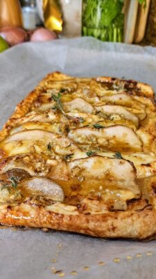Picture this, a base of flaky puff pastry on top a spread of fig jam and slices of creamy brie that melts into the flaky crust, crumbles of gorgonzola add a tangy twist. The star of the show? Thin slices of ripe juicy pears, their natural sweetness caramelizing slightly as they bake. Sweet and savory in every delicious bite.