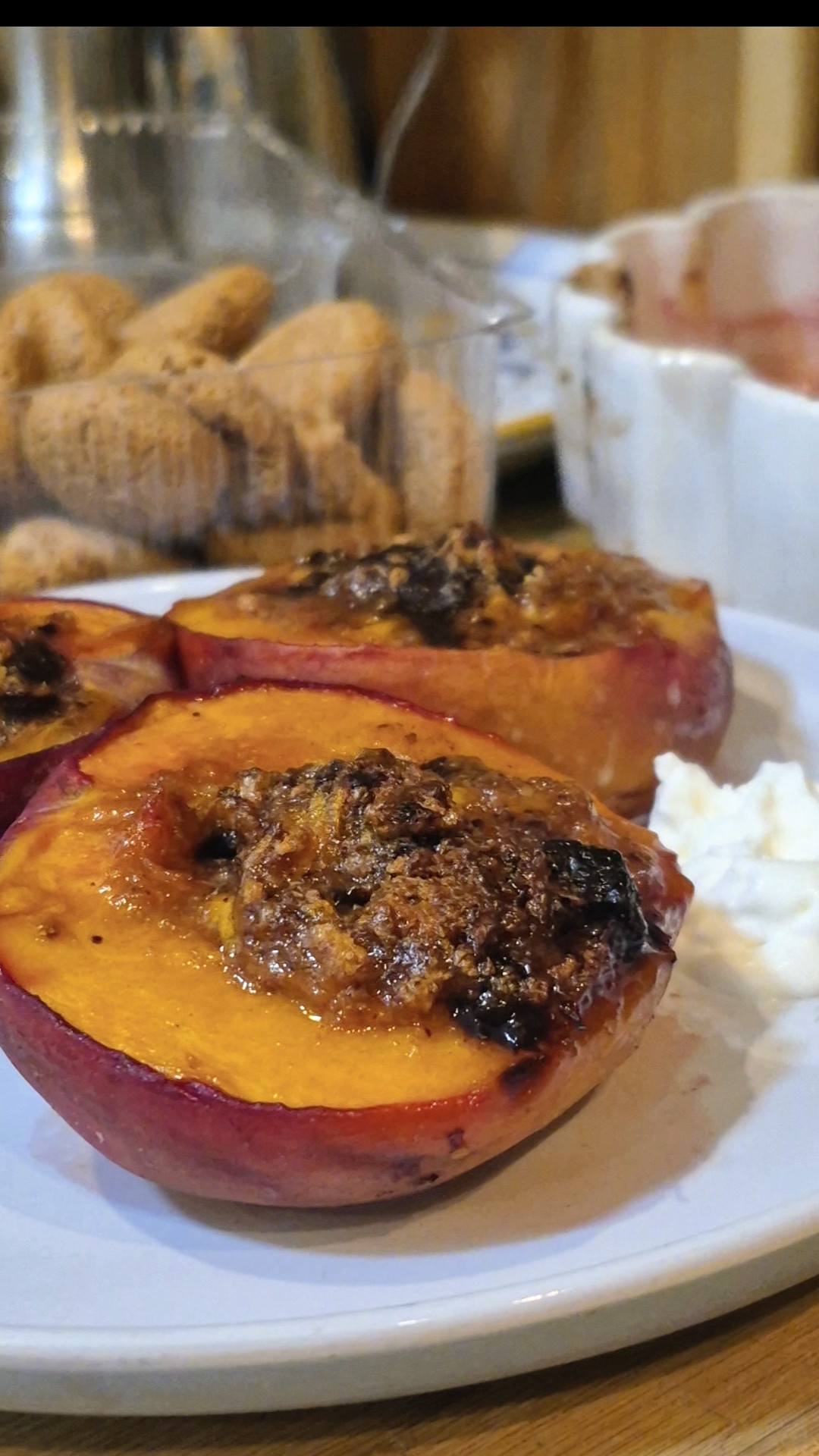 I’m using just four peaches here, perfect for a cozy gathering or an effortless dinner finale. The amaretti bring a delicate crunch and deep almond flavor, enriched with a splash of liqueur and a bit of butter. Whether you serve them warm with gelato or enjoy them at room temperature with a spoonful of whipped cream, they feel both nostalgic and just a little indulgent.