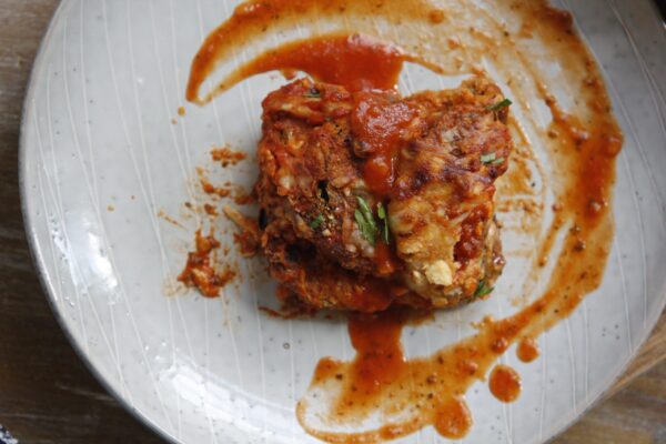This is a classic Italian baked eggplant parmesan, bursting with robust Italian flavors. It’s a lightened up version with air fried breadcrumb crusted eggplant and layered with marinara, cheeses and herbs.