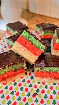 Italian rainbow Christmas cookies , also known as tricolor cookies, are a delicious festive cookie that blends flavor, color and tradition. These iconic treats, often associated with Italian – American bakeries, are not actually cookies in the traditional sense but rather delicate almond sponge cakes layered with sweet jam. Each layer is vibrantly dyed in the colors of the Italian flag – green, white and red. Then the entire thing is coated with a thin layer of chocolate, adding richness that perfectly complements the nutty almond flavor and tart jam. Often enjoyed during the Christmas season.