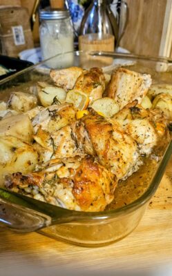 Adding potatoes to this Italian roasted chicken dinner makes it a complete meal with minimal effort. As the chicken roast , the potatoes absorbs all the deliciousness of the pan juices. You can also add additional vegetables like carrots, zucchini or what ever fits your taste for an additional nutritional boost. To make this Italian roasted lemon chicken dinner even more easy use a ready-cut chicken. You can also customize this recipe by using more parts of the chicken you like and less of the chicken pieces you don’t.