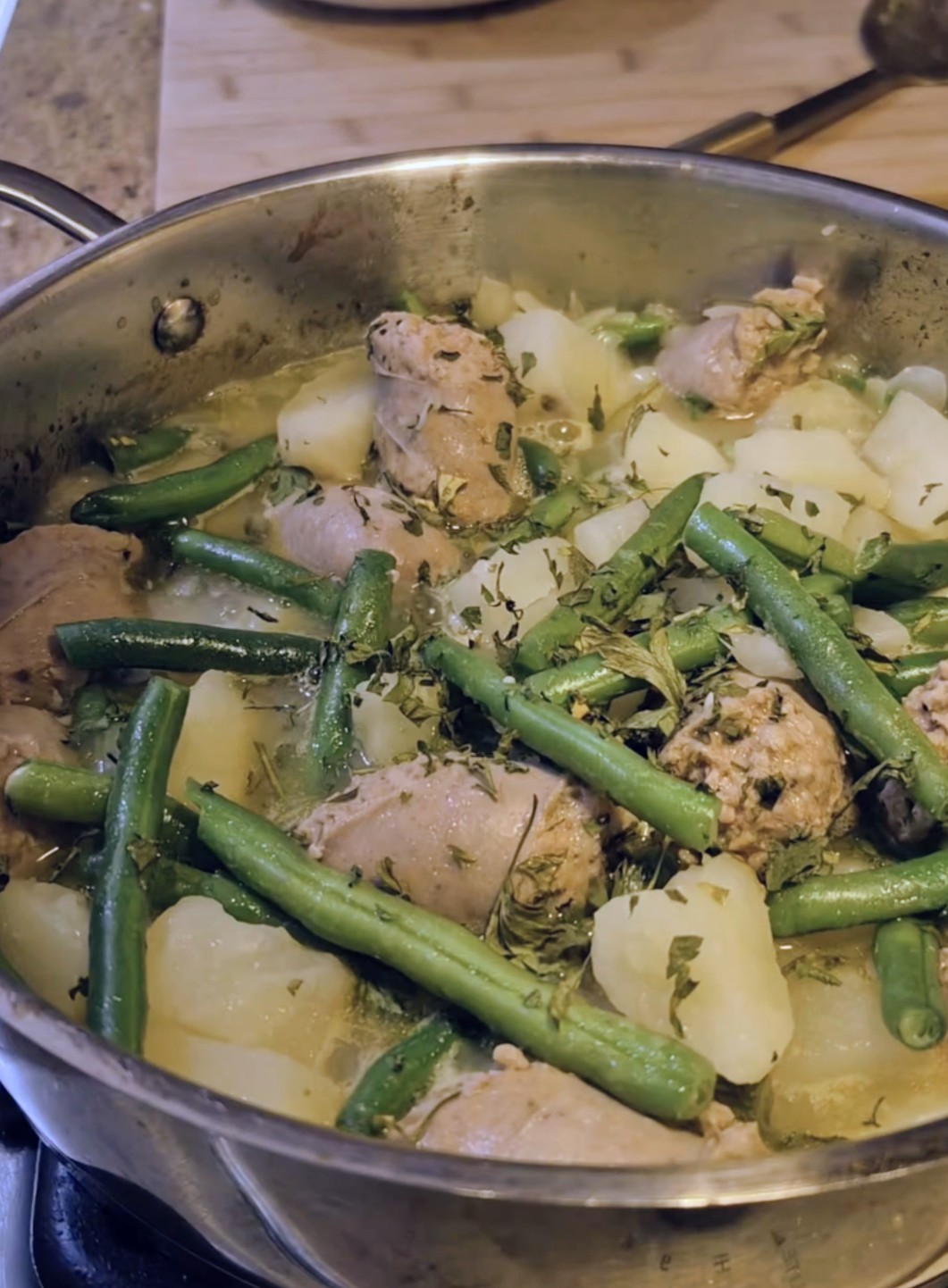 Add the chicken stock, green beans, oregano, crushed red pepper flakes, salt, and black pepper. Cover and cook for 6–8 minutes, or until the green beans are tender and the potatoes are fully cooked.