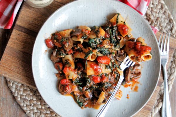 This low key pasta recipe embraces all there is to love about Italian food in a quick family friendly dinner. Fresh mushrooms, spinach and tomatoes tossed in a light marinara sauce.