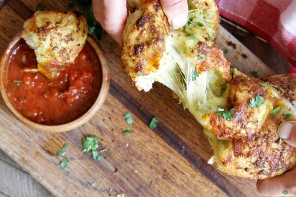 I don’t eat bread by itself often, but when I do this is the one I crave. Toasty, cheesy spread with pesto sauce and sprinkled with salty parmesan, piping hot from the oven make this bread a family favorite.