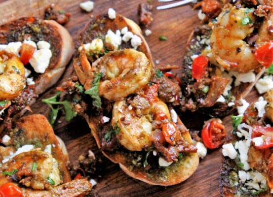 Succulent large shrimp coated with pesto, sautéed in a delicious sauce flavored with salty crispy prosciutto makes this the prefect topping for the toasted Italian bread smeared with pesto, then topped with tangy feta cheese.