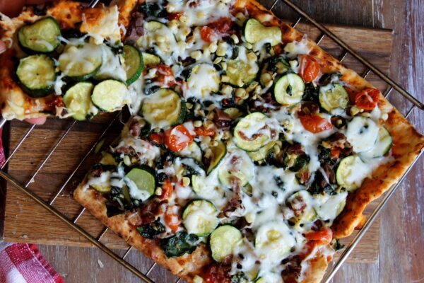 When I made this pizza the other day, I was craving something colorful and full of garden grown flavors. Anyone that has ever planted even just one zucchini plant knows, from just one you’ll have zucchini’s all Summer.