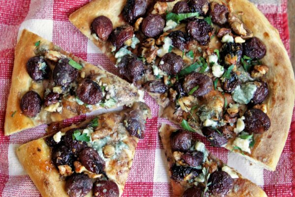 Roasting the grapes sweetens them and releases their juices producing a sweet, syrupy pizza sauce. Mix the sharp bite of the gorgonzola with the mild taste of grapes, honey and thyme, add crunchy walnuts and you a recipe for delicious results.