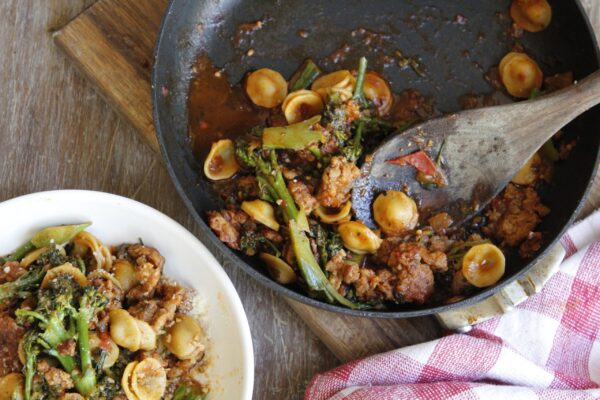 This Sausage Broccolini orecchiette Pasta recipe works well with chicken and shrimp too.