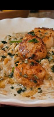 This recipe combines the succulence of large perfectly seared scallops with the comforting texture of orzo, creating a taste that  elevates this seared scallop creamy orzo to the next level!!!