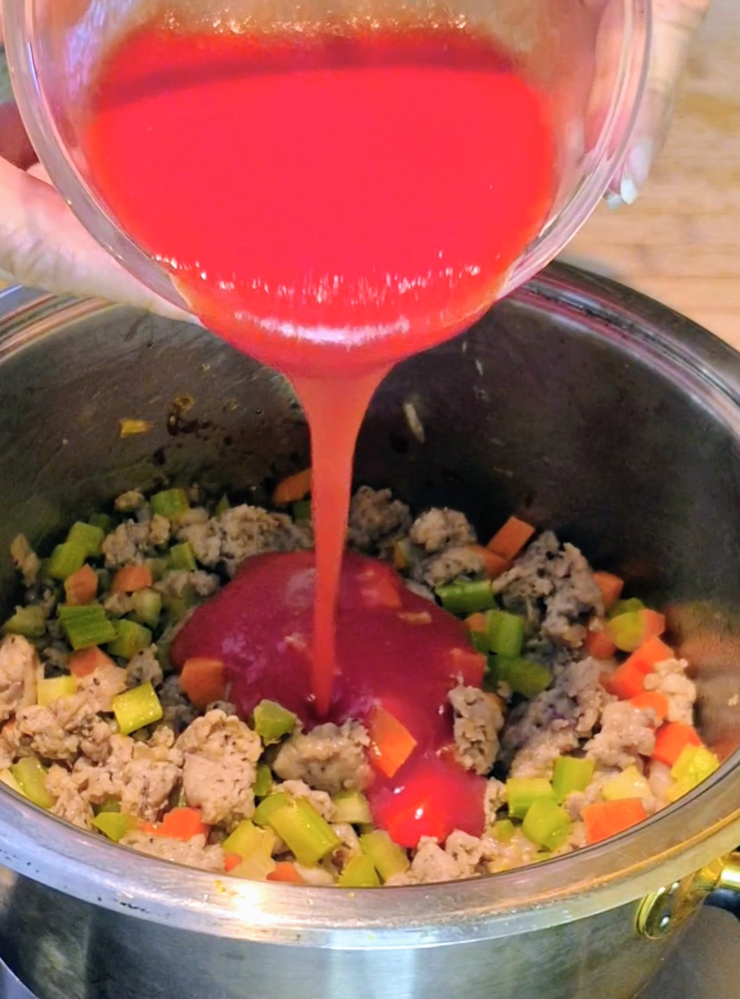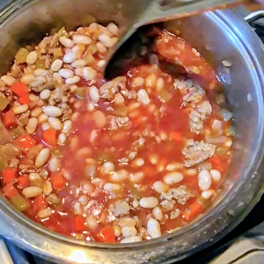 Combine ingredients: Return sausage to the pot. Add crushed tomatoes, soaked beans, broth, water, oregano, thyme, and red pepper flakes. Stir to combine.