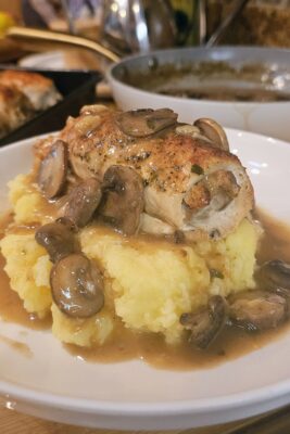 This recipe takes simple chicken breasts and transforms them into something spectacular. Each breast is butterflied, filled with the same savory sausage and mushroom stuffing recipe I use for my holiday turkey, then rolled up and baked until golden and juicy. To finish, everything is smothered in my rich, velvety mushroom gravy — the perfect finishing touch.