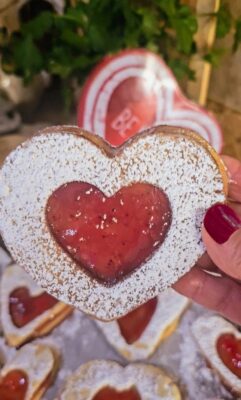 Tuscan Bullseye heart cookies “occhi di Bue a cuoro, are a delightful Italian cookie perfect for Valentine’s Day or any special occasion. These delicate, buttery shortbread cookies are filled with a luscious jam or chocolate and shaped into hearts for a romantic touch.