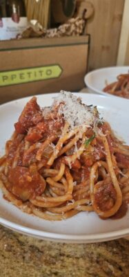 - Deglaze the pan with the red wine waiting until it evaporates, before adding the tomatoes. Cover and simmer for 1 hour. In the meantime cook your pasta el dente. Add a cup of pasta water to the sauce if too thick. Toss the pasta in this vegetarian Bolognese sauce add in the Italian parsley. Plate top with the grated pecorino Romano. ENJOY!!!!